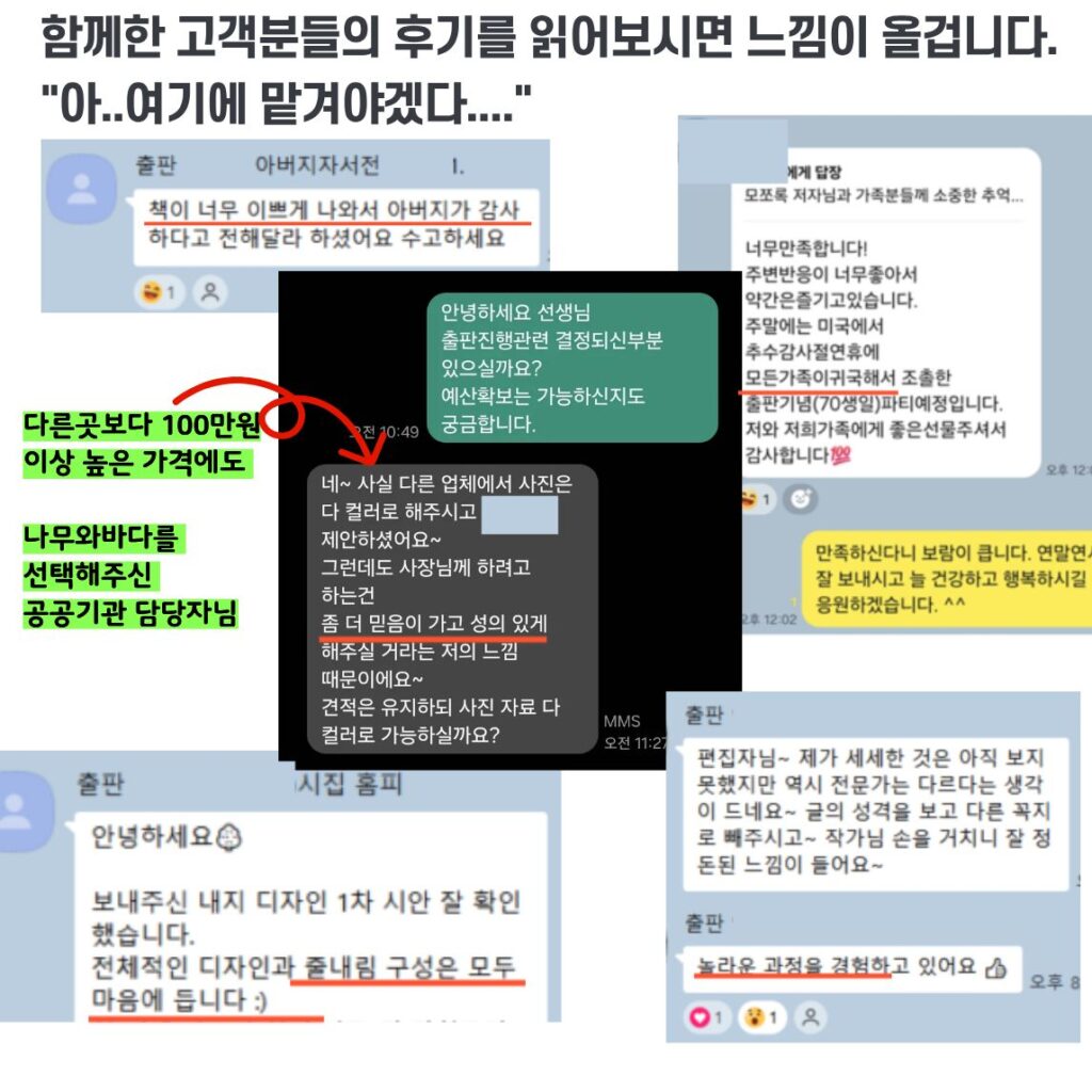 전문가의 손길을 거쳐 독자 친화적인 책으로 만들고 싶다면 수천만원까지도 비용이 산출되기도 합니다. 하지만, 자서전의 경우 개인, 집안, 가족의 역사를 기록으로 남기는 의미있는 일이기에 저희 나무와바다 출판사도 합리적인 가격으로 책을 출판하실 수 있도록 안내드리고 있습니다.